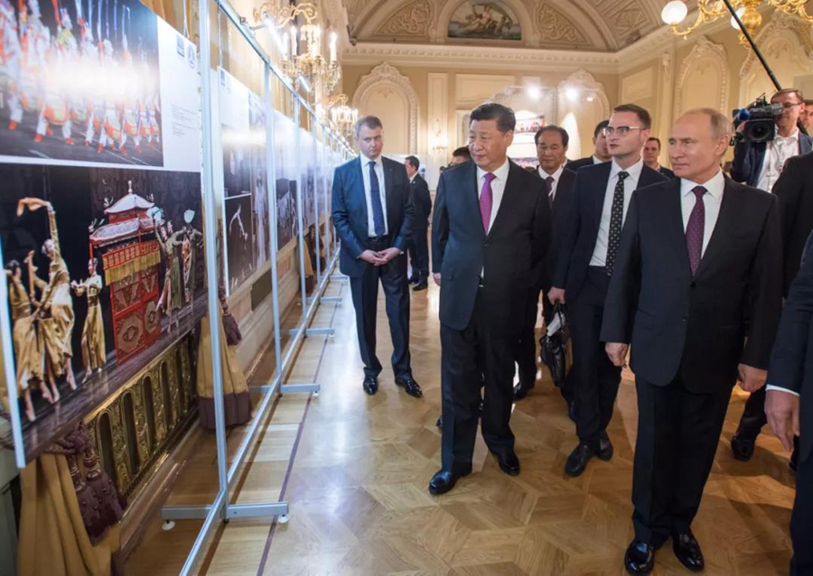 ↑6月5日,習(xí)主席和普京總統(tǒng)在莫斯科大劇院共同出席中俄建交70周年紀(jì)念活動(dòng)?;顒?dòng)前,兩國(guó)元首共同參觀中俄建交70周年圖片展。新華社記者李學(xué)仁攝
