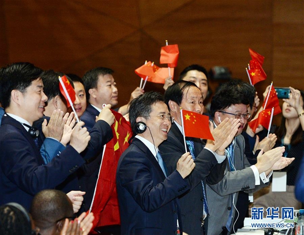 7月6日,在阿塞拜疆巴庫,中國代表團(tuán)在世界遺產(chǎn)大會(huì)上慶祝中國良渚古城遺址申遺成功。中國良渚古城遺址6日在阿塞拜疆巴庫舉行的世界遺產(chǎn)大會(huì)上獲準(zhǔn)列入世界遺產(chǎn)名錄。至此,中國世界遺產(chǎn)總數(shù)已達(dá)55處,位居世界第一。新華社發(fā)(巴巴耶夫 攝)