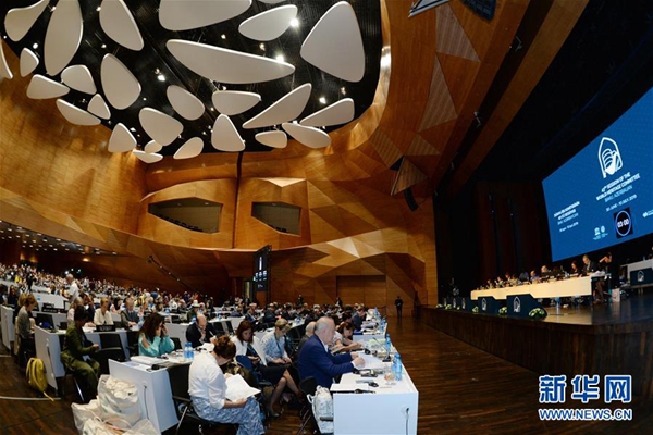 這是7月5日在阿塞拜疆巴庫拍攝的世界遺產(chǎn)大會(huì)現(xiàn)場。第43屆聯(lián)合國教科文組織世界遺產(chǎn)委員會(huì)會(huì)議(世界遺產(chǎn)大會(huì))5日在阿塞拜疆巴庫舉行,會(huì)議審議通過將中國黃(渤)海候鳥棲息地(第一期)列入世界自然遺產(chǎn)名錄。該項(xiàng)目成為中國第54處世界遺產(chǎn)。新華社發(fā)(巴巴耶夫 攝)
