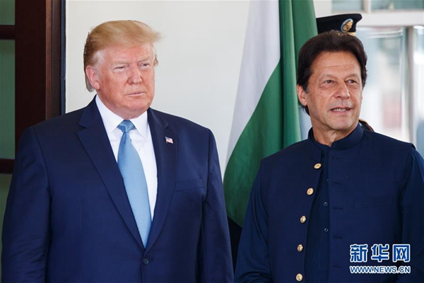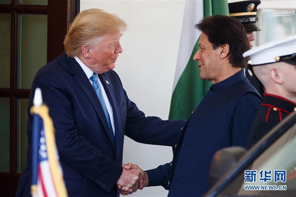 7月22日,在美國(guó)華盛頓白宮,美國(guó)總統(tǒng)特朗普(左)歡迎巴基斯坦總理伊姆蘭·汗。新華社發(fā)(沈霆 攝)