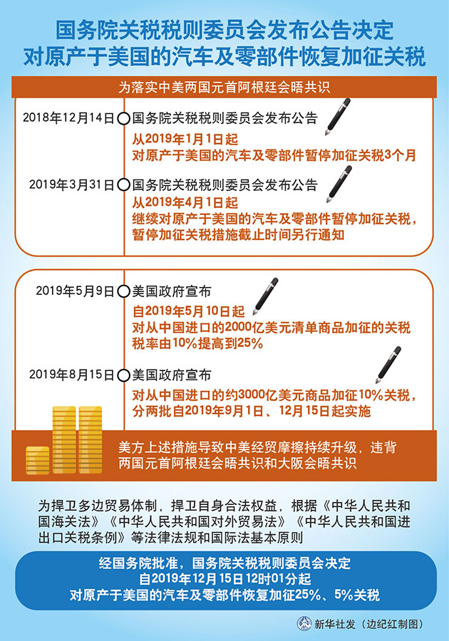 為捍衛(wèi)多邊貿易體制,捍衛(wèi)自身合法權益,根據(jù)《中華人民共和國海關法》《中華人民共和國對外貿易法》《中華人民共和國進出口關稅條例》等法律法規(guī)和國際法基本原則,經國務院批準,國務院關稅稅則委員會決定,自2019年12月15日12時01分起,對原產于美國的汽車及零部件恢復加征25%、5%關稅。
