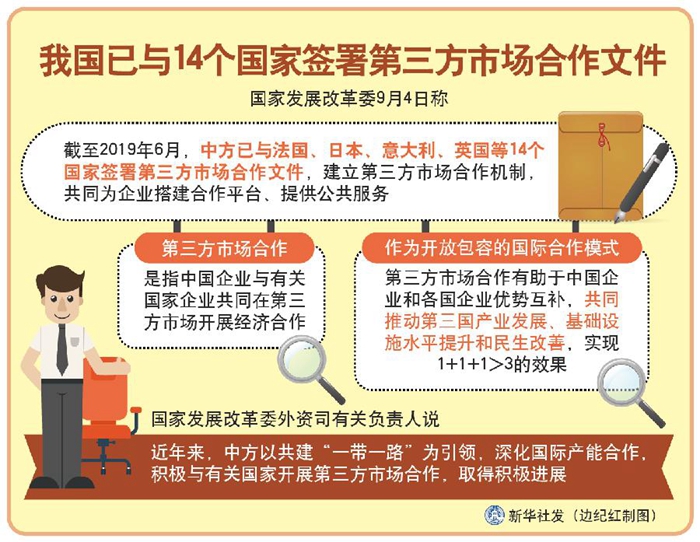 新華社北京9月4日電(記者安蓓)國(guó)家發(fā)展改革委4日稱,截至2019年6月,中方已與法國(guó)、日本、意大利、英國(guó)等14個(gè)國(guó)家簽署第三方市場(chǎng)合作文件,建立第三方市場(chǎng)合作機(jī)制,共同為企業(yè)搭建合作平臺(tái)、提供公共服務(wù)。