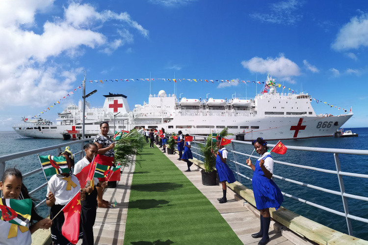 2018年10月12日,在多米尼克首都羅索,當(dāng)?shù)貙W(xué)生揮動(dòng)多中兩國國旗歡迎中國海軍和平方舟醫(yī)院船首次到訪。(新華社發(fā))