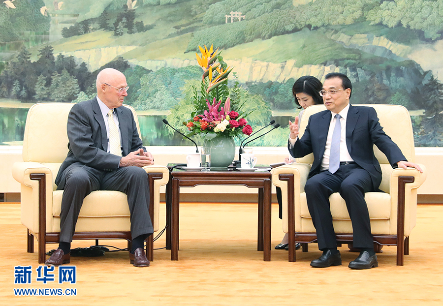 10月23日,國務(wù)院總理李克強在北京人民大會堂會見美國前財政部長保爾森。 新華社記者 姚大偉 攝