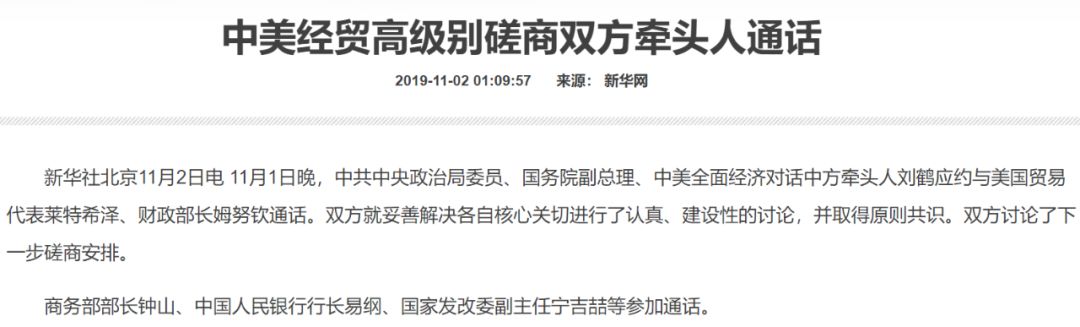 在充滿“變”的世界中,中美經(jīng)貿(mào)磋商進(jìn)程也在發(fā)生著變化。11月1日晚,中美經(jīng)貿(mào)高級(jí)別磋商雙方牽頭人通了電話。