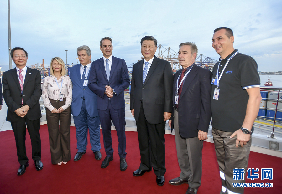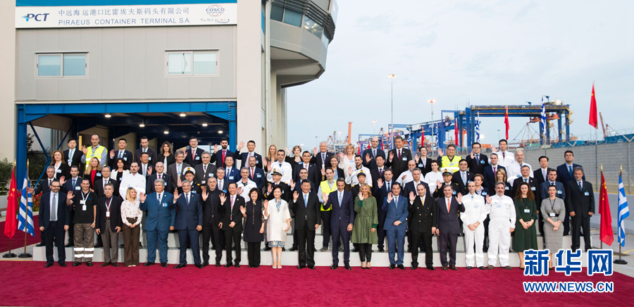 當(dāng)?shù)貢r間11月11日,國家主席習(xí)近平和夫人彭麗媛在希臘總理米佐塔基斯夫婦陪同下,共同參觀中遠(yuǎn)海運(yùn)比雷埃夫斯港項目。這是習(xí)近平夫婦和米佐塔基斯夫婦同中遠(yuǎn)當(dāng)?shù)貑T工等合影。 新華社記者 黃敬文 攝