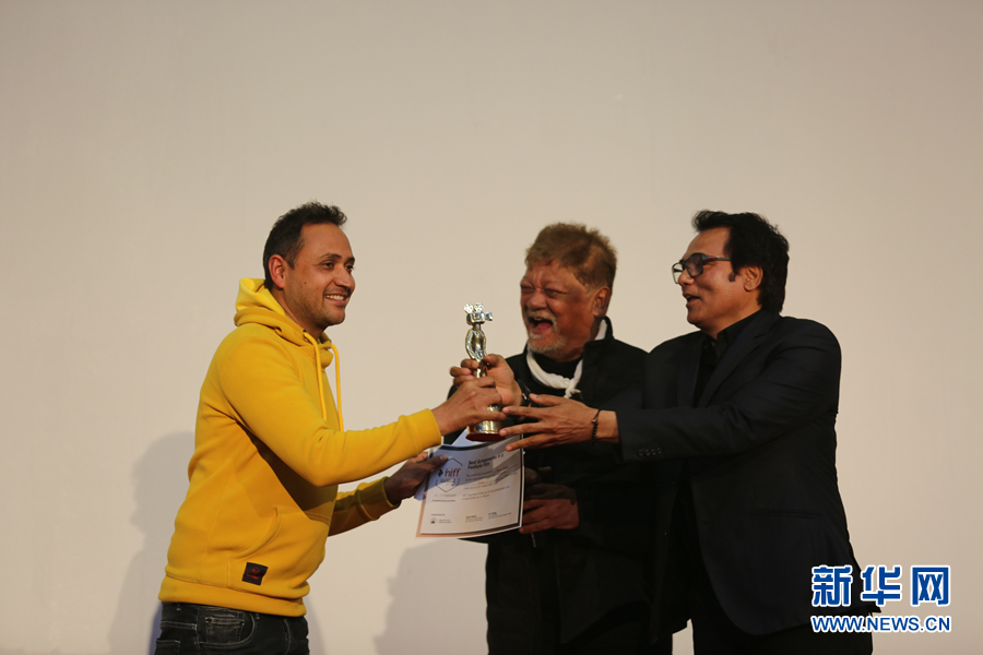 2月17日,第三屆尼泊爾國際電影節(jié)的閉幕儀式在加德滿都市政大廳內(nèi)舉行,資深電影人士正在給獲獎?wù)撸ㄗ螅╊C獎。本屆電影節(jié)2月13日開始,一共有來自40個國家和地區(qū)的80部影片入選,其中中國和哈薩克斯坦聯(lián)合拍攝的《音樂家》作為開幕電影,備受關(guān)注。記者 唐薇 攝?