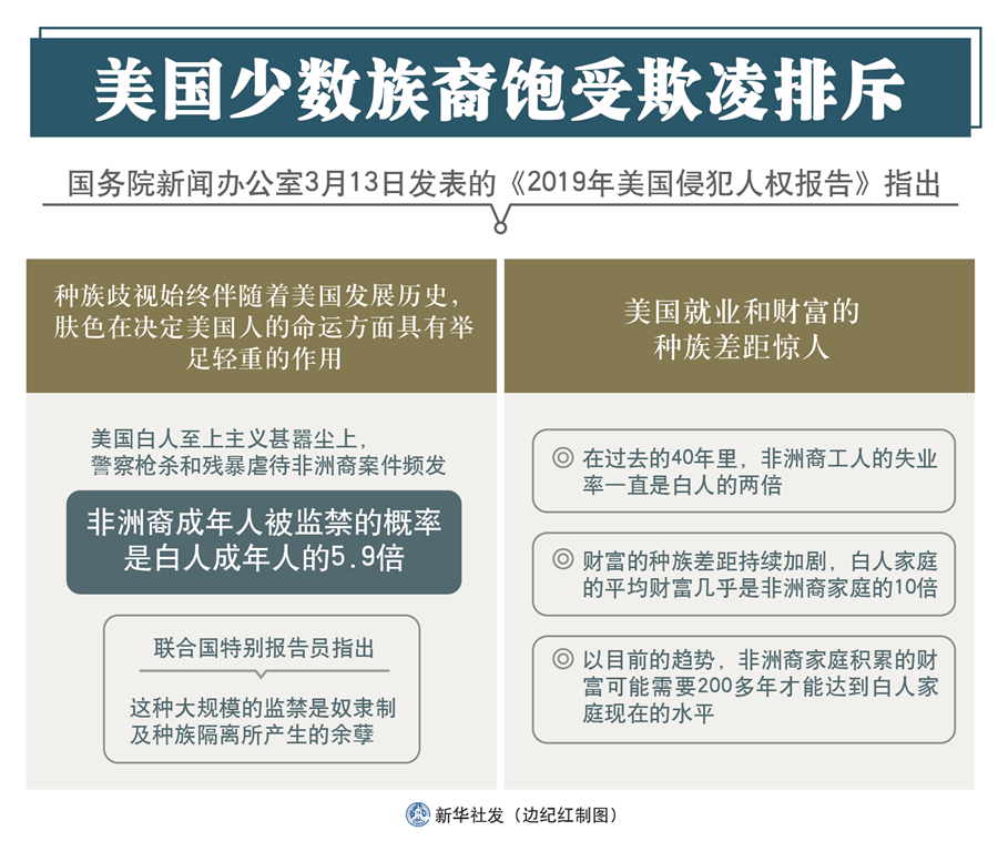 新華社北京3月13日電(記者王子銘、申安妮)國(guó)務(wù)院新聞辦13日發(fā)表的《2019年美國(guó)侵犯人權(quán)報(bào)告》指出,美國(guó)少數(shù)族裔飽受欺凌排斥。