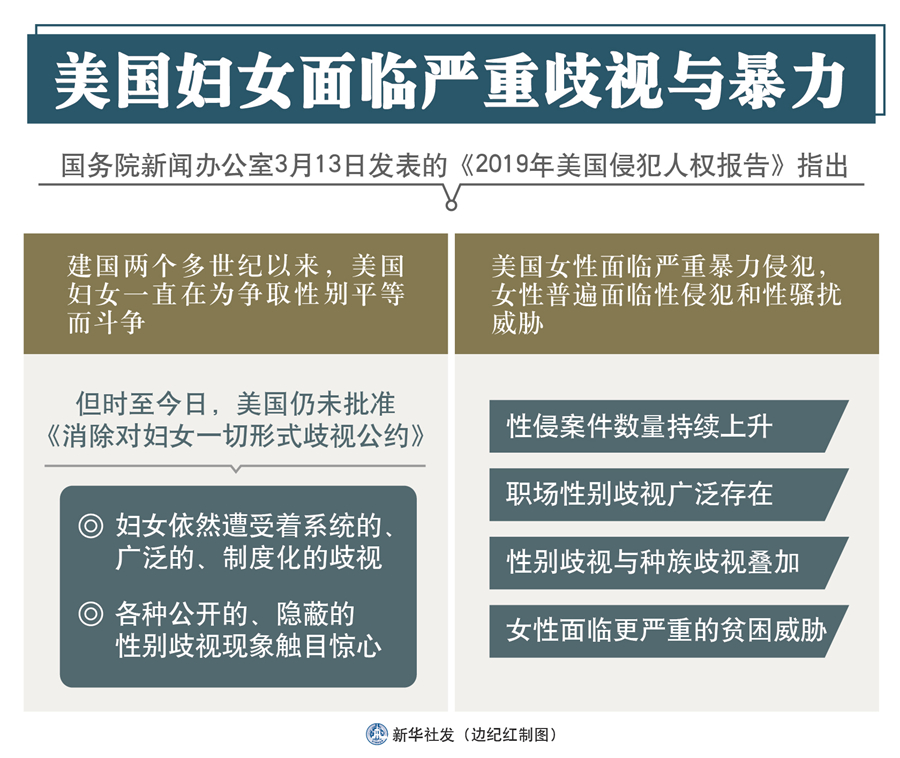 新華社北京3月13日電(記者王鵬、張云龍)國務院新聞辦13日發(fā)表的《2019年美國侵犯人權報告》指出,美國婦女面臨嚴重歧視與暴力。