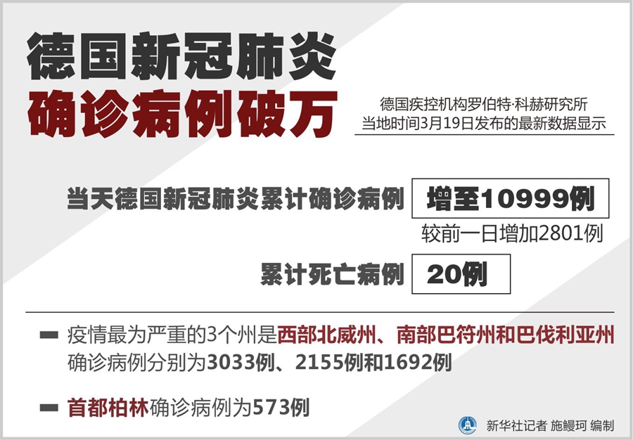 新華社柏林3月19日電(記者張毅榮 田穎)德國疾控機(jī)構(gòu)羅伯特·科赫研究所19日發(fā)布的最新數(shù)據(jù)顯示,當(dāng)天德國新冠肺炎累計(jì)確診病例增至10999例,較前一日增加2801例,累計(jì)死亡病例20例。