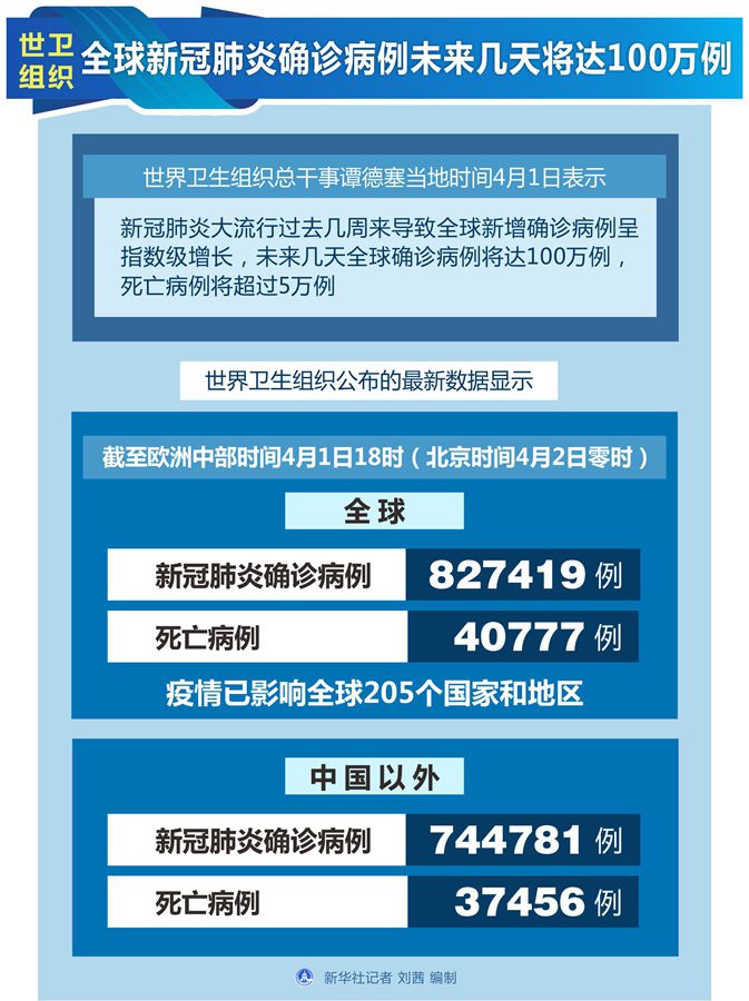 新華社日內(nèi)瓦4月1日電(記者劉曲)世界衛(wèi)生組織總干事譚德塞4月1日表示,新冠肺炎大流行過去幾周來導(dǎo)致全球新增確診病例呈指數(shù)級增長,未來幾天全球確診病例將達(dá)100萬例,死亡病例將超過5萬例。