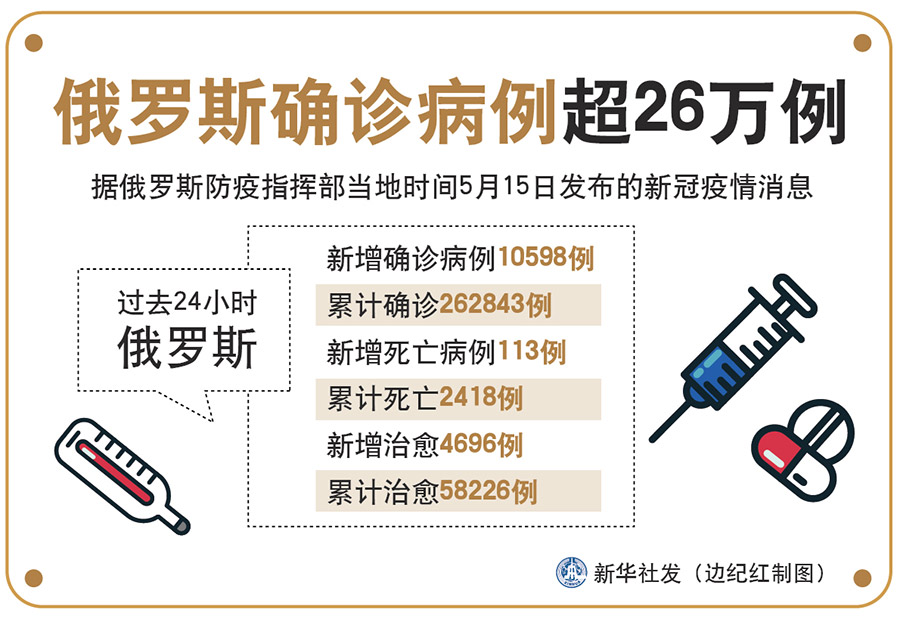 新華社莫斯科5月15日電(記者魯金博)據(jù)俄羅斯防疫指揮部15日發(fā)布的新冠疫情消息,過去24小時(shí)俄新增確診病例10598例,累計(jì)確診262843例;新增死亡病例113例,累計(jì)死亡2418例;新增治愈4696例,累計(jì)治愈58226例。