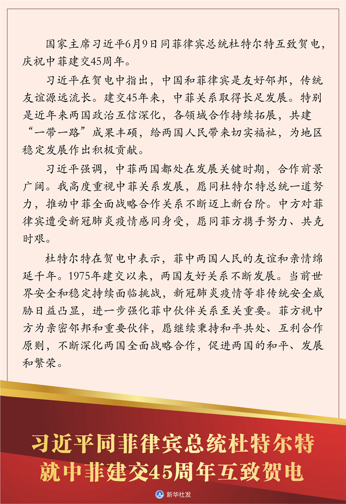 新華社北京6月9日電 國家主席習(xí)近平6月9日同菲律賓總統(tǒng)杜特爾特互致賀電,慶祝中菲建交45周年。