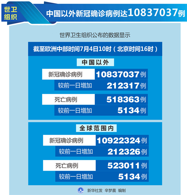 世衛(wèi)組織每日疫情報(bào)告顯示,截至歐洲中部時(shí)間4日10時(shí)(北京時(shí)間16時(shí)),中國以外新冠確診病例較前一日增加212317例,達(dá)到10837037例;中國以外死亡病例較前一日增加5134例,達(dá)到518363例。