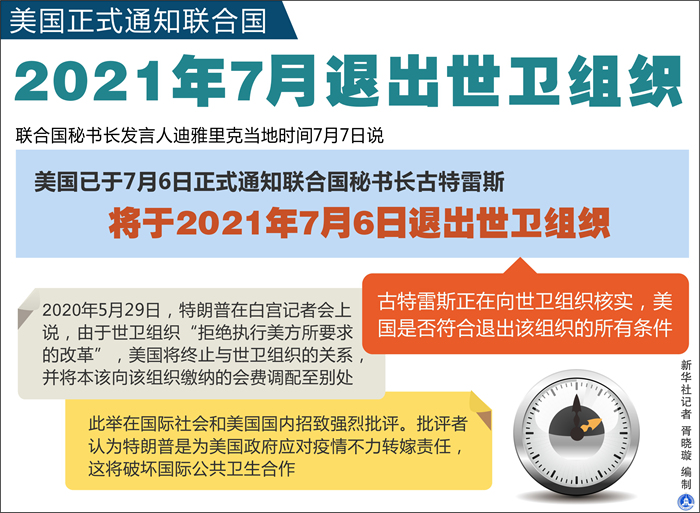 新華社聯(lián)合國7月7日電(記者王建剛)聯(lián)合國秘書長發(fā)言人迪雅里克7日說,美國已于6日正式通知聯(lián)合國秘書長古特雷斯,將于明年7月退出世界衛(wèi)生組織。