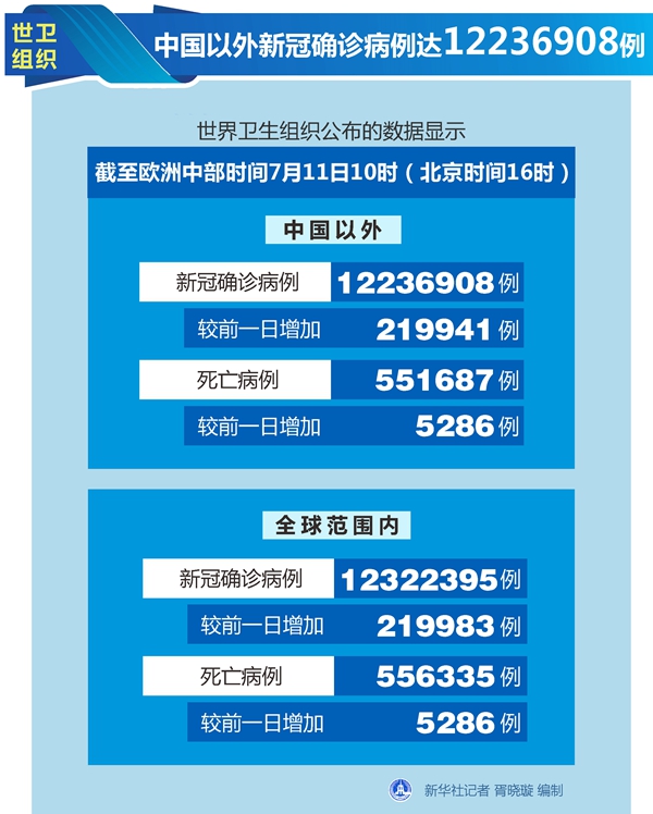 世衛(wèi)組織每日疫情報(bào)告顯示,截至歐洲中部時(shí)間11日10時(shí)(北京時(shí)間16時(shí)),中國以外新冠確診病例較前一日增加219941例,達(dá)到12236908例;中國以外死亡病例較前一日增加5286例,達(dá)到551687例。