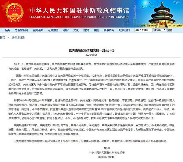 7月21日,美方單方面挑起事端,突然要求中方關(guān)閉駐休斯敦總領(lǐng)館。美方此舉嚴重違反國際法和國際關(guān)系基本準則,嚴重違反中美領(lǐng)事條約有關(guān)規(guī)定,蓄意破壞中美關(guān)系。中方對此予以強烈譴責并堅決反對。