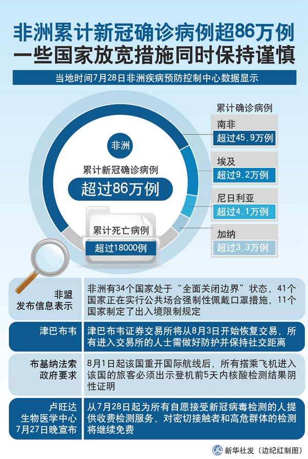 新華社洛美7月28日電 綜合新華社駐非洲地區(qū)記者報(bào)道:非洲疾病預(yù)防控制中心28日數(shù)據(jù)顯示,非洲累計(jì)新冠確診病例超過86萬例,累計(jì)死亡病例超過18000例。在逐步放寬措施的同時(shí),一些非洲國家情況不容樂觀,政府保持謹(jǐn)慎態(tài)度。