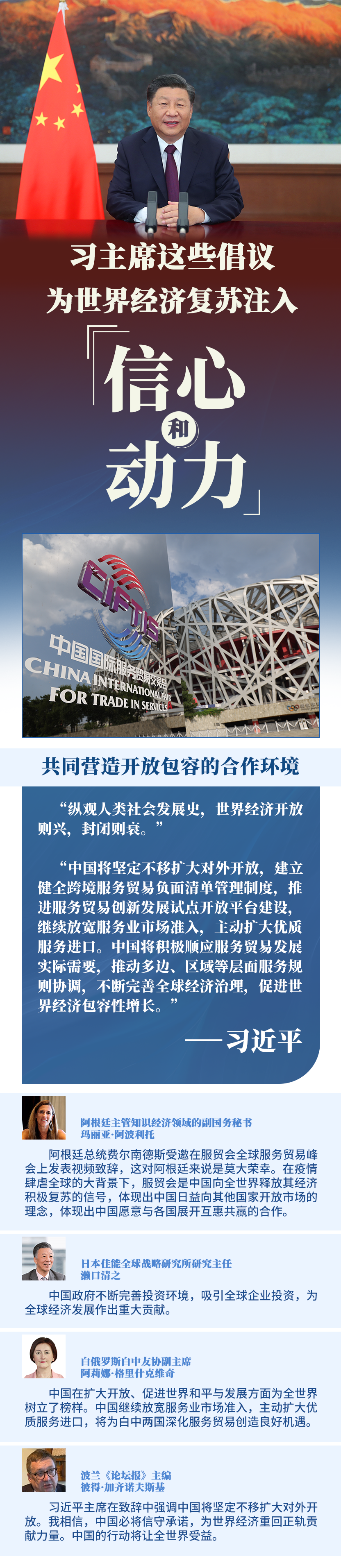 在全球范圍新冠疫情尚未得到全面控制、經(jīng)濟(jì)全球化遭遇逆流的背景下,習(xí)主席就促進(jìn)全球服務(wù)業(yè)開放合作提出3點(diǎn)倡議,為推動(dòng)世界經(jīng)濟(jì)盡快復(fù)蘇注入信心和動(dòng)力,向國際社會(huì)展現(xiàn)中國負(fù)責(zé)任大國的作為和擔(dān)當(dāng)。