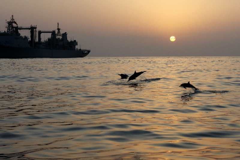 中國海軍赴亞丁灣索馬里海域護(hù)航編隊(duì)始終秉持海洋命運(yùn)共同體理念,堅(jiān)持人與大海和諧相處,注重生態(tài)環(huán)境保護(hù),贏得大自然積極回報(bào),經(jīng)常出現(xiàn)編隊(duì)艦艇航行時(shí)有成群海豚伴航、待機(jī)集結(jié)時(shí)有各類魚群相伴的和諧場景。
