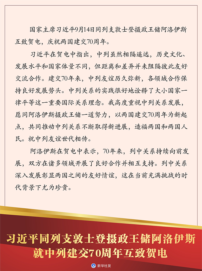習(xí)近平在賀電中指出,中列雖然相隔遙遠(yuǎn),歷史文化、發(fā)展水平和國(guó)家體量不同,但距離和差異并未阻隔彼此友好交流合作。建交70年來(lái),中列友誼歷久彌新,各領(lǐng)域合作保持良好發(fā)展勢(shì)頭。中列關(guān)系的實(shí)踐很好地詮釋了大小國(guó)家一律平等這一重要國(guó)際關(guān)系理念。我高度重視中列關(guān)系發(fā)展,愿同阿洛伊斯攝政王儲(chǔ)一道努力,以兩國(guó)建交70周年為新起點(diǎn),共同推動(dòng)中列關(guān)系不斷取得新進(jìn)展,造福兩國(guó)和兩國(guó)人民。祝中列友誼世代相傳。