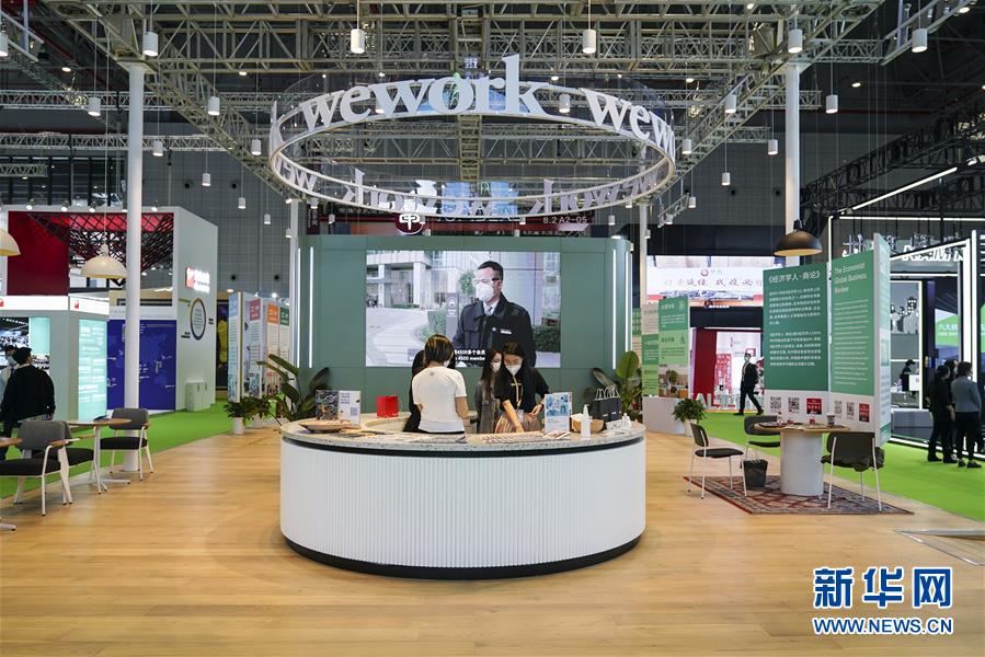 11月5日拍攝的第三屆進(jìn)博會(huì)服務(wù)貿(mào)易展區(qū)wework展臺(tái)。 新華社記者 張豪夫 攝