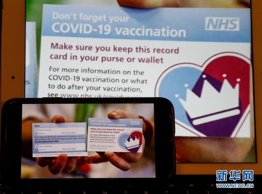 這是12月8日在英國倫敦拍攝的顯示新冠疫苗接種卡的電腦屏幕和手機(jī)屏幕。