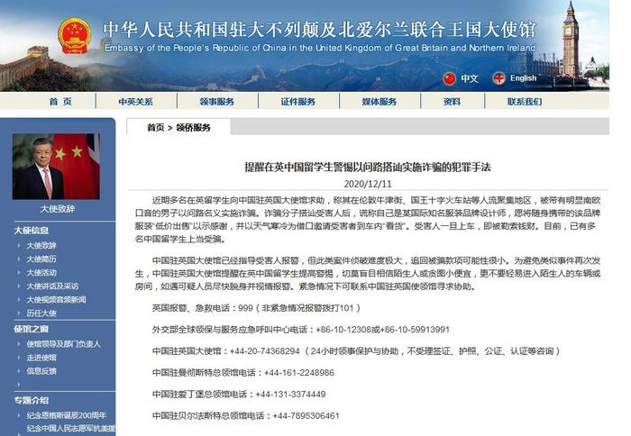 中國駐英國大使館已經(jīng)指導(dǎo)受害人報警,但此類案件偵破難度極大,追回被騙款項可能性很小。為避免類似事件再次發(fā)生,中國駐英國大使館提醒在英中國留學(xué)生提高警惕,切莫盲目相信陌生人或貪圖小便宜,更不要輕易進(jìn)入陌生人的車輛或房間,如遇可疑人員盡快脫身并視情報警。緊急情況下可聯(lián)系中國駐英國使領(lǐng)館尋求協(xié)助。