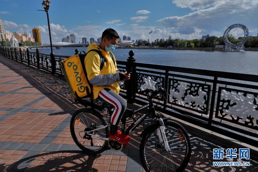 8月18日,在哈薩克斯坦首都努爾蘇丹,外賣小哥薩別爾別科夫騎車送餐。新華社發(fā)(奧斯潘諾夫攝)
