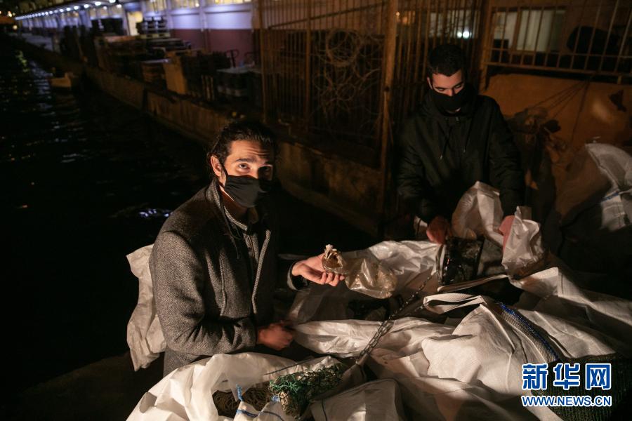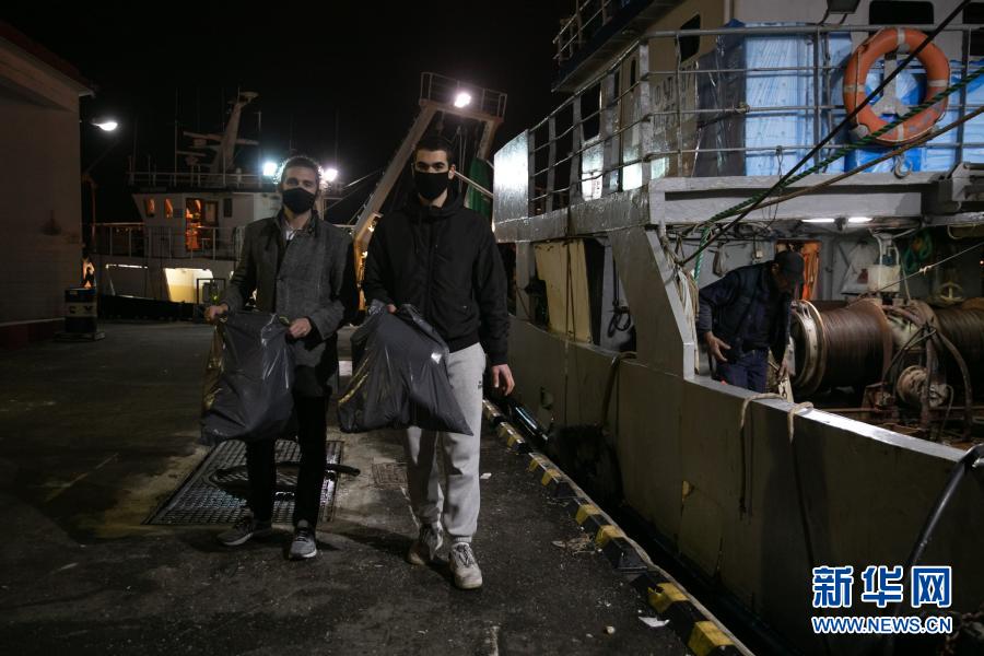 12月17日,在希臘比雷埃夫斯地區(qū)一處港口,阿拉帕基斯(右)與同事一同收集剛從漁船上卸下的塑料垃圾。新華社發(fā)(萊夫特里斯·帕察里斯攝)