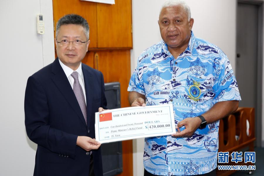 當(dāng)天在斐濟總理辦公室舉行的儀式上,中國駐斐濟大使錢波代表中國政府向斐濟總理姆拜尼馬拉馬轉(zhuǎn)交了這筆援助款。