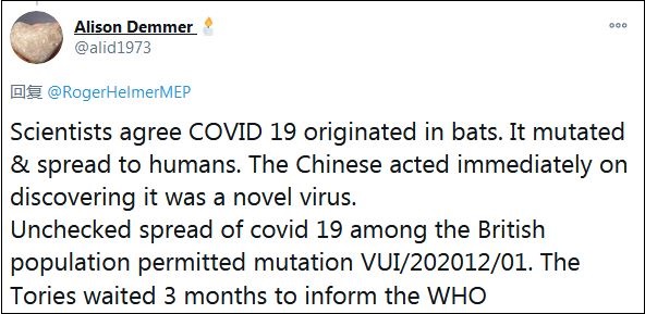 還有一名網(wǎng)友對(duì)比稱(chēng):“科學(xué)家同意新冠病毒起源自蝙蝠,變異后傳播給人類(lèi),中國(guó)人發(fā)現(xiàn)這是一種新病毒后,立即采取了行動(dòng)。新冠病毒在英國(guó)人口中無(wú)限制的傳播,導(dǎo)致了變異新冠病毒(VUI/202012/01),保守黨等了3個(gè)月才通知世衛(wèi)組織?!?/p>