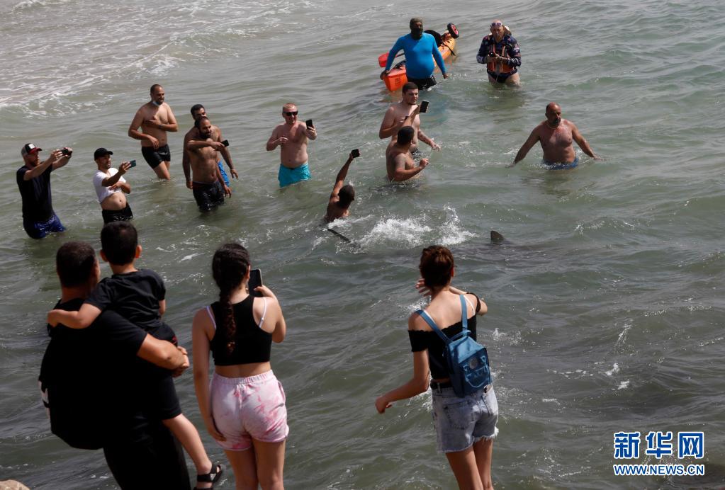 4月20日,在以色列北部城市哈代拉的海邊,鯊魚從人們身邊游過。