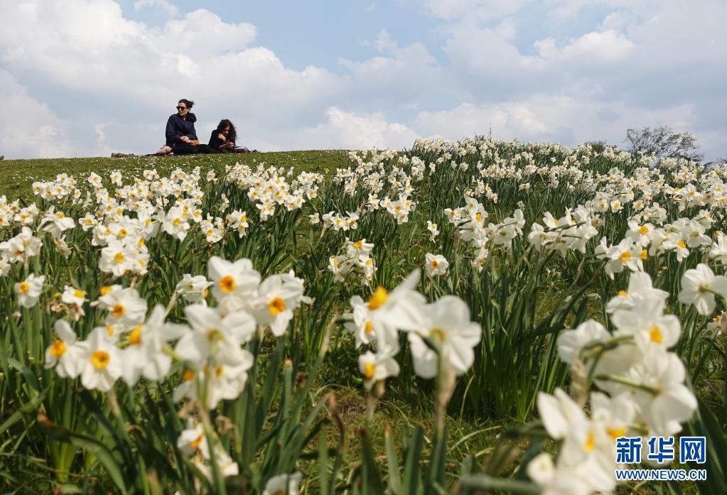 4月21日,在法國(guó)巴黎一處公園,人們?cè)邗r花盛開的山坡上曬太陽(yáng)。