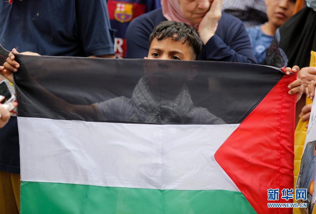 5月15日,一名兒童在黎巴嫩首都貝魯特參加抗議示威活動,聲援巴勒斯坦民眾。