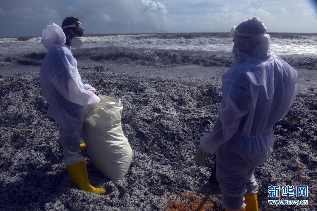 5月27日,安全人員在距離科倫坡30多公里的斯里蘭卡西海岸城市尼甘布清理被海水沖到這里的集裝箱船“X-PRESS PEARL”的碎片。