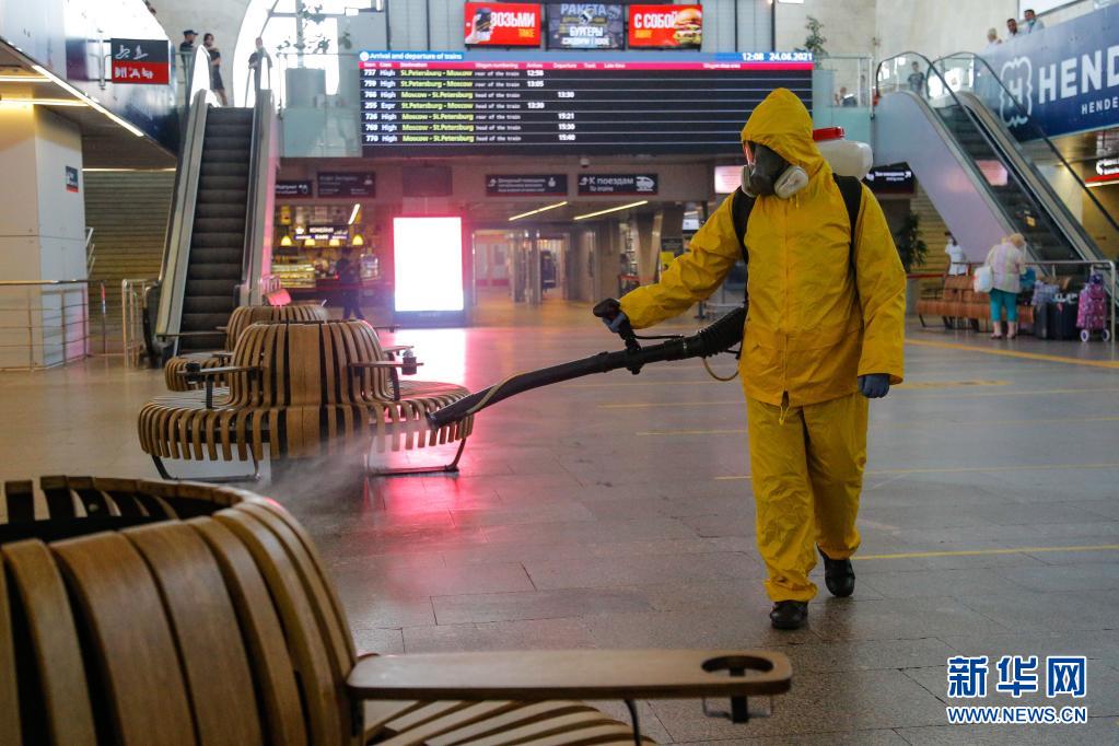 6月24日,工作人員身著防護(hù)服在俄羅斯莫斯科一個(gè)火車站進(jìn)行消毒作業(yè)。