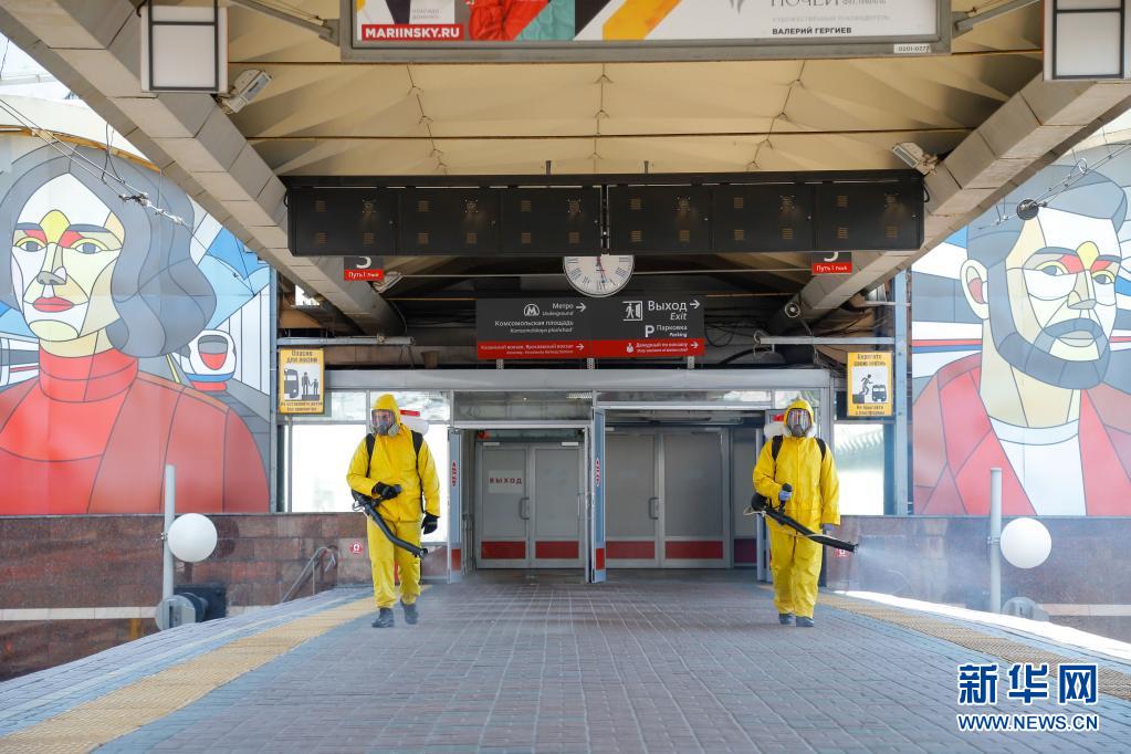 6月24日,工作人員身著防護(hù)服在俄羅斯莫斯科一個(gè)火車(chē)站進(jìn)行消毒作業(yè)。