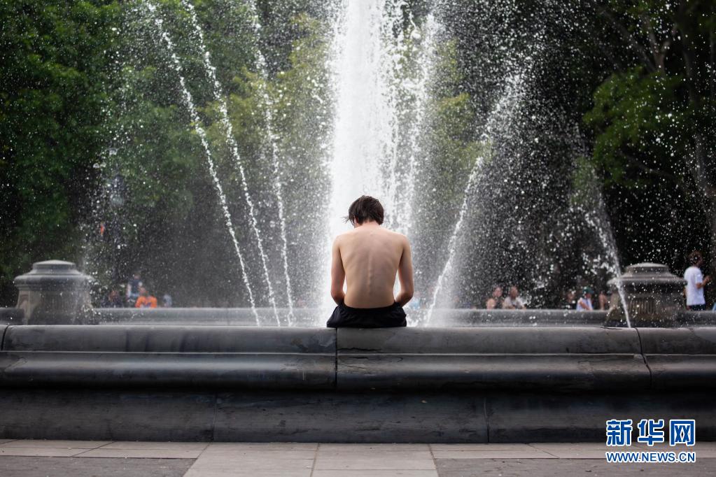 6月29日,在美國紐約一處公園,一名男子坐在噴泉邊納涼。
