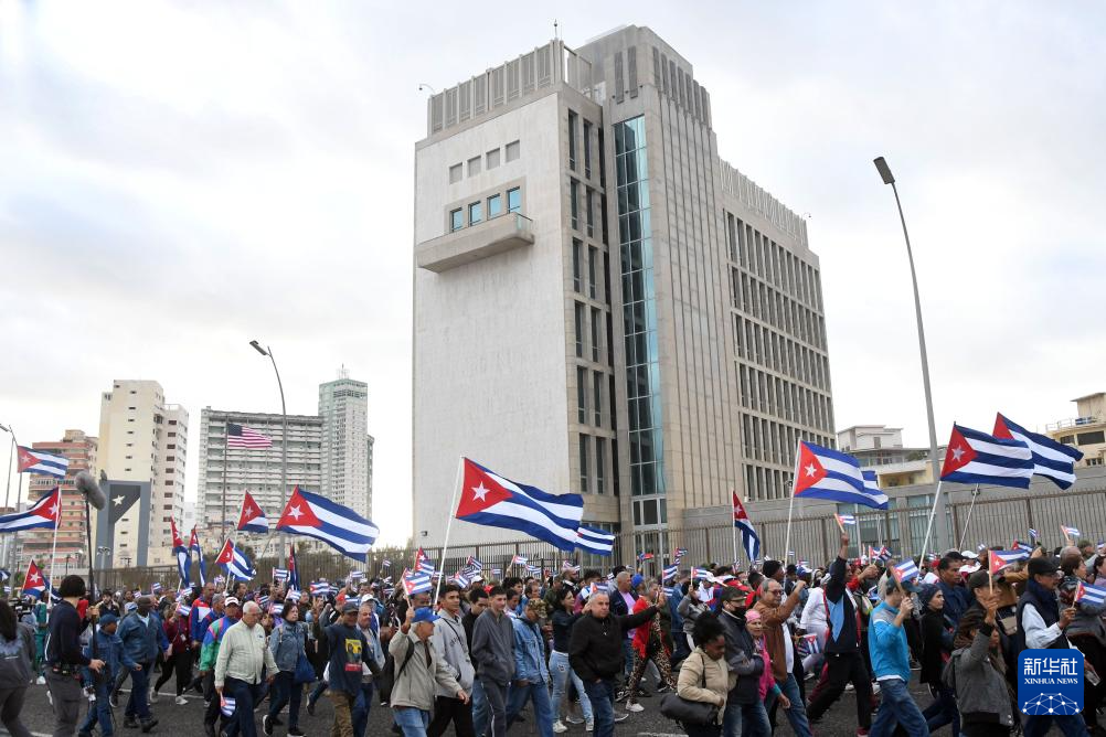 1月16日,在古巴首都哈瓦那,民众在美国驻古巴大使馆前举行反美游行。新华社发(华金·埃尔南德斯摄)