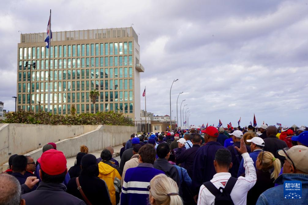 1月16日,在古巴首都哈瓦那,民众在美国驻古巴大使馆前举行反美游行。新华社记者 蒋彪 摄